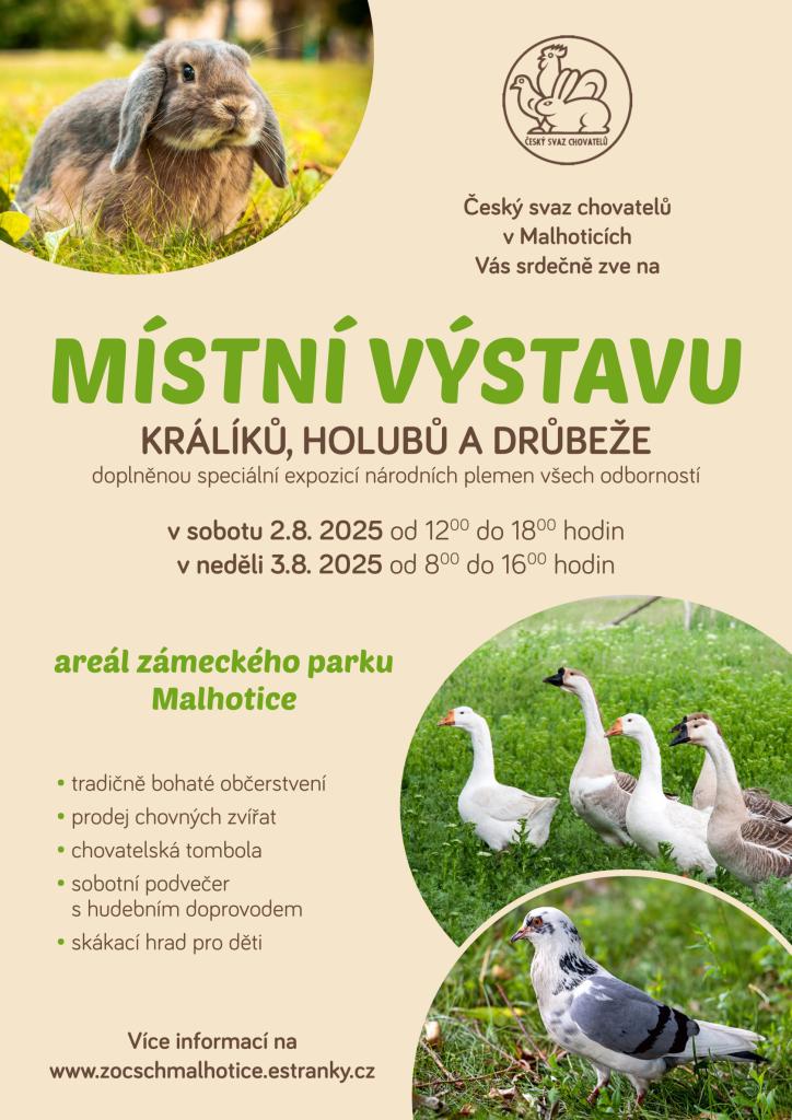 Chovatelská výstava v sobotu 2. 8. a v neděli 3. 8. 2025 v areálu zámeckého parku v Malhoticích.