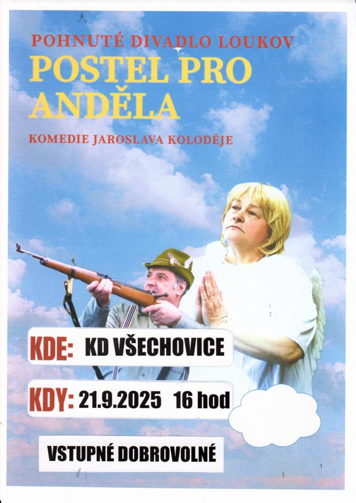 Pohnuté divadlo Loukov uvede 21. 9. 2025 v KD Všechovice komedii Jaroslava Koloděje POSTEL PRO ANDĚLA