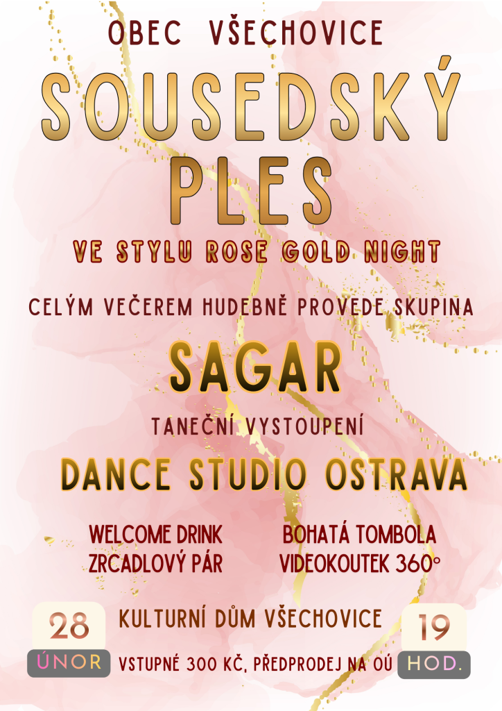 Obec Všechovice zve na Sousedský ples, který se uskuteční v sobotu 28. 2. 2026 od 19:00 hod. v kulturním domě.